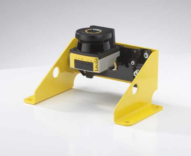 Mit der speziell für den ultrakompakten Sicherheits-Laserscanner entwickelten Halterung lässt sich das Gerät horizontal und vertikal sehr einfach ausrichten. Im Servicefall kann der Laserscanner mit nur vier Schrauben schnell und einfach ausgetauscht werden (Bild: Leuze).